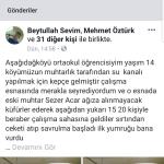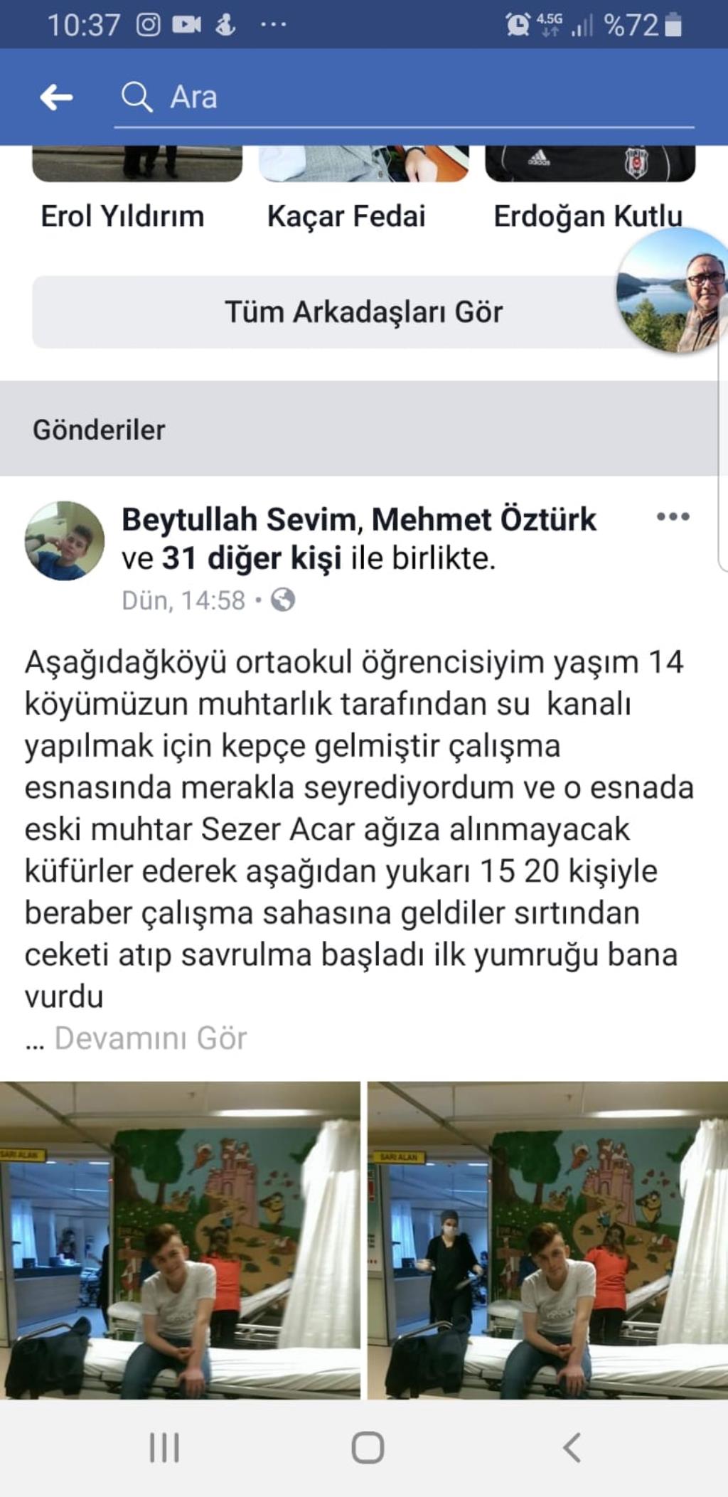 Aşağıdağköyü ortaokul öğrencisiyim yaşım 14 köyümüzun muhtarlık tarafından su kanalı yapılmak için kepçe gelmiştir çalışma esnasında merakla seyrediyordum ve o esnada eski muhtar Sezer Acar ağıza alınmayacak küfürler ederek aşağıdan yukarı 15 20 kişiyle beraber çalışma sahasına geldiler sırtından ceketi atıp savrulma başladı ilk yumruğu bana vurdu ve yere düştüm bir kaç kerede tekmeyle vurdu ve ben bayilmisim ondan sonrasını bilmiyorum gözlerimi açtığımda alapli devlet hastanesindeydim ve su an Ereğli devlet hastanesindeyim savunmasız olduğum halde bana yumruk ve tekmeyi vuran eski muhtar Sezer Acar koruma altında olarak geziyor ben ise 3 gündür okula gidemiyorum daha ne zamana kadarda gidemeyecegim belirsiz benim bu kayıplarımı sınıfta kaldığım zaman sorumlusu nu çoook merak ediyorum sayın alapli kaymakamizdan okula devamsizligimi kimler tarafından benim geleceğimi kar atmak isteyen Sezer Acar in korumalığını yapan kollluk kuvvetlerine emir veren yetkililer aynı yetkiyi benim içinde rica ediyorum saygılarımla