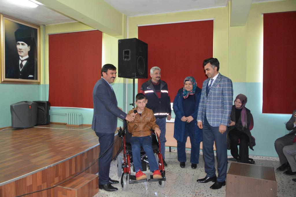 Karabük Alparslan Gazi Anadolu Lisesi Sosyal Yardımlaşma ve Dayanışma Kulübü tarafından toplum hizmeti çalışmaları kapsamında düzenlenen kermeste toplanan paralarla temin edilen akülü tekerlekli sandalye Sevgibağı Özel Eğitim Meslek Okulu 9. sınıf öğrencisi Samet Celal Özçelik ve ailesine teslim edildi.