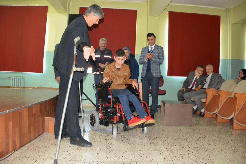Konuşmanın ardından akülü tekerlekli sandalye Özçelik'e teslim edildi.