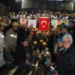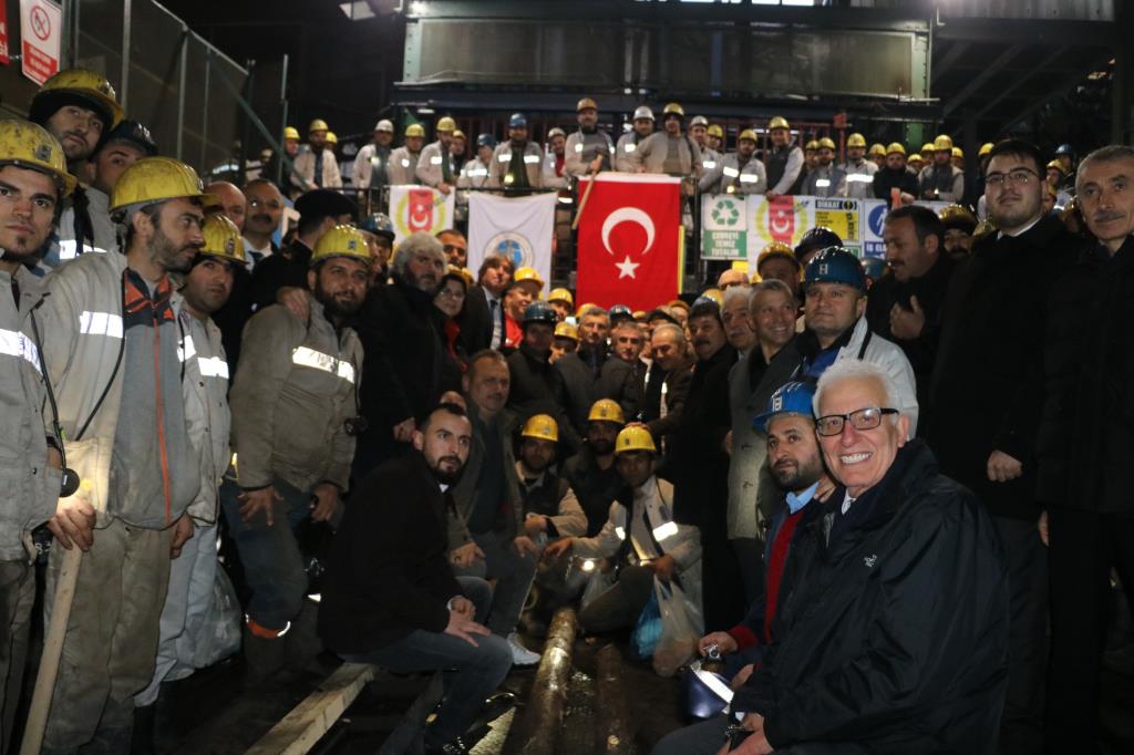 Gece vardiyasından çıkan işçiler ile gündüz vardiyasında yerin metrelerce altında çalışacak olan işçilerin katıldığı program saygı duruşunda bulunulmasının ardından İstiklal Marşı'nın okunması ile devam etti.