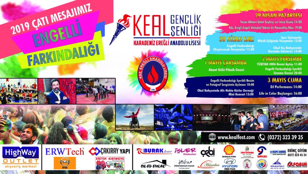Festival boyunca yapılacak etkinlikler hakkında bilgi veren Arslan, etkinliklere tüm Ereğli halkını davet etti. Arslan, “Bu sene yapacağımız etkinlikler, 29 Nisan pazartesi saat 11.00’de resim sergimiz var. Bu sergimizin önemi de ilçemizde bulunan İş okulunda eğitim gören engelli öğrencilerimizi okulumuza davet ederek, okulumuz öğrencileri ile beraber resim çizmelerini sağladık. Burada yapılan resimleri sergileyeceğiz. Sergimizin açılışına özel çocuklarımızda katılacak. Öğlen saat 14.00-17.00 arası ülkemizin önemli yazarlarından birisi olan Arş. Yazar Ahmet Ümit’in hem söyleşi hem de imza günü olacak. 19.00-21.00 saatleri arasında okulumuz voleybol takımı ile ilçemizde bulunan engelli voleybolcu arkadaşlar ile oturarak voleybol maçı yapacağız. Burada ki amacımız öğrencilerimize engelli olarak spor yapma duygusunu tattırmak olacak. Bu maça tüm Ereğli halkını bekliyoruz. 30 Nisan Salı günü Saat 11.00’de tekerlekli sandalye yarışı-koltuk değnekleri ile penaltı turnuvası yapacağız. Saat 12.00’de okul spor salonunda müzik eşliğinde yarışmalar, 13.00’ de okul kış bahçesinde 6 nokta körler derneği mini konser, 14.00’de ise okul kış bahçesinde karaoke gösterimiz olacak. 1 Mayıs Çarşamba günü yaklaşık 400 öğrenci ile Abant Gölünde pikniğe gideceğiz. Burada Abant gölü piknik alanında engelli farkındalığını amaçlayan yarışmalar yapacağız ve birde AVM ziyaretimiz olacak. 2 Mayıs Perşembe günü saat 10.00’da yaklaşık 46 projemizin sergileneceği Tubitak 4006 Açılış Kokteyli olacak. İnşallah Vali Bey’de bu açılışta bulunacak. Aynı zamanda Valimiz geldiğinde bir açılış daha gerçekleştirecek. BAKKA’dan hibe ile oluşturduğumuz robotik kodlama ve sanal pilotluk sınıfımızın açılışı olacak. Bu zamana kadar bu sınıflarda ürettiğimiz ürünlerinde sergisi olacak. Akşam saat 20.00’de çok anlamlı bir etkinliğimiz olacak. Spor salonumuzu açık hava sinemasına dönüştüreceğiz. Burada tüm misafirlerimize ENGELLİ farkındalığını anlatan “BLACK” ADLI FİLMİN gösterimini gerçekleştireceğiz. Herkesin beklediği 3 Mayıs Cuma günü okulumuzun bahçesine 50 metrelik bir sahne kurduracağız. Yaklaşık bin kişilik dışarıdan bir katılım olacağını düşünüyoruz. Öncelikle ana sahne de Altı Nokta Körler Derneği’nden davet ettiğimiz görme engelli birisi mini konser verecek. Ardından okulumuz müzik grupları sahne alacak ve kendi parçalarını söyleyecekler. Saat 14.00’de profesyonel bir DJ sahne alacak. Ardından geçen sene Batı Karadeniz’de ilk defa gerçekleştirilen life in color adını verdiğimiz boya cümbüşü etkinliğimiz olacak. Bu sene bu etkinliğimizi bin kişi ile yapmayı planlıyoruz. Dışarıdan etkinliğimize katılmak isteyenler kealfest.com sitesinden kayıt yaptıran ve okuldan referans gösteren kişileri bu etkinliğe kabul edeceğiz. Gayet güvenli, boyalarımız gıda boyası olduğundan hiçbir zararı yoktur. Bu etkinliğimizin ardından DJ tekrar sahne alacak ve etkinliğimiz son bulmuş olacak.