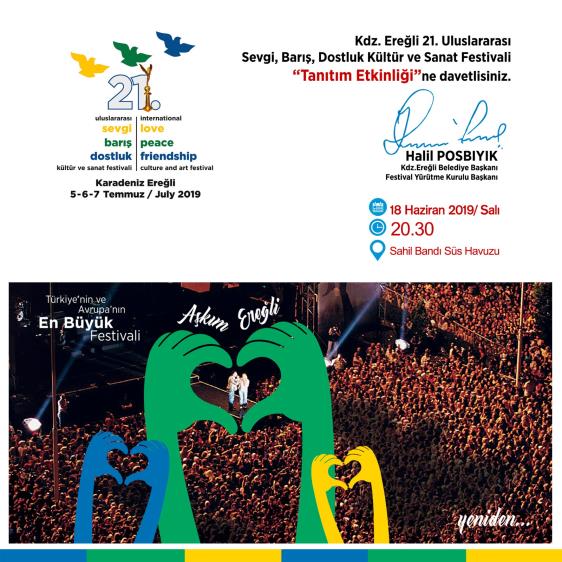 5-6-7 Temmuz tarihlerinde 21. yaşını kutlayacak olan Kdz. Ereğli 21. Uluslararası Sevgi, Barış, Dostluk Kültür ve Sanat Festivali’nin tanıtım etkinliği 18 Haziran Salı günü saat 20:30’da sahil bandı süs havuzunda gerçekleştirilecek.