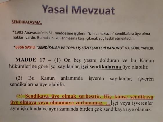 Yapılan açıklamada “Hak-İş Konfederasyonuna bağlı Hizmet-İş Sendika’sı İl Başkanı ve Temsilcilerine yapılan eylem; gerçekleri yansıtmamaktadır. Belediyemizde daimi kadro statüsünde çalışan isçilerimiz ilk belediye başkanlığı dönemim olan 1994 yılından önce de TÜRK-İŞ’e bağlı Belediye-İş sendikasının üyesi bulunmakta idiler. Hiçbir zaman işçilerimizin bu konudaki tercihine müdahil olmadık; Anayasal hak olan Sendikalara Üye olma hakkı her zaman işçilerimizin kendi tercihi olmuştur. Ancak; gelinen noktada belediyemizde yetkili bir işçi sendikası var iken, KHK ile kurulan Belediye Personel Limited Şirketi çalışanlarının geçmiş dönemde, Hizmet-İş Sendikasına baskı ile bir gecede geçirildikleri bilgisi tarafımıza ulaşmıştır. Kaldı ki KHK ile kurulan şirketimizde çalışanların mevzuat çerçevesinde 2020 yılı Haziran ayına kadar sendikal bir hak kazanma durumu da bulunmamakta iken, aynı kurumda iki işçi sendikasının varlığı çalışma barışını bozmuş dolayısı ile halkımıza sunulan hizmetlerin kalite ve verimini düşürmüştür. Basın duyurusunda söylenildiği üzere hiçbir şirket personeli arkadaşımıza şu veya bu sendikaya geçeceksiniz diye bir talimatımız olmamıştır. Belediye yönetimimizde hiçbir çalışanın sendikal haklarına müdahale edilmemiş, kimse ötekileştirilmemiş herkesin kendi irade ve tercihine bırakılmıştır” denildi.