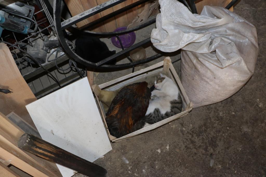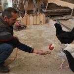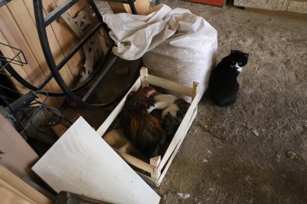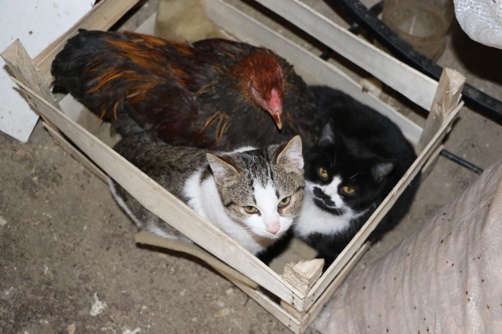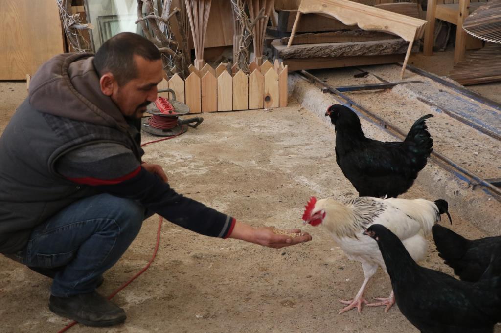 Marangoz ustası Serkan Sevingen, atölyesinde tavuk ve horozların bulunduğunu bunun yanında ayrı ayrı iki tane kediyi sahiplendiğini söyleyerek, tavukların yanına aldığı başka horozun onlarla geçinemeyince kedilerle dostluk kurduğunu söyledi.