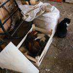 Marangoz atölyesindeki horoz ve kedilerin dostluğu