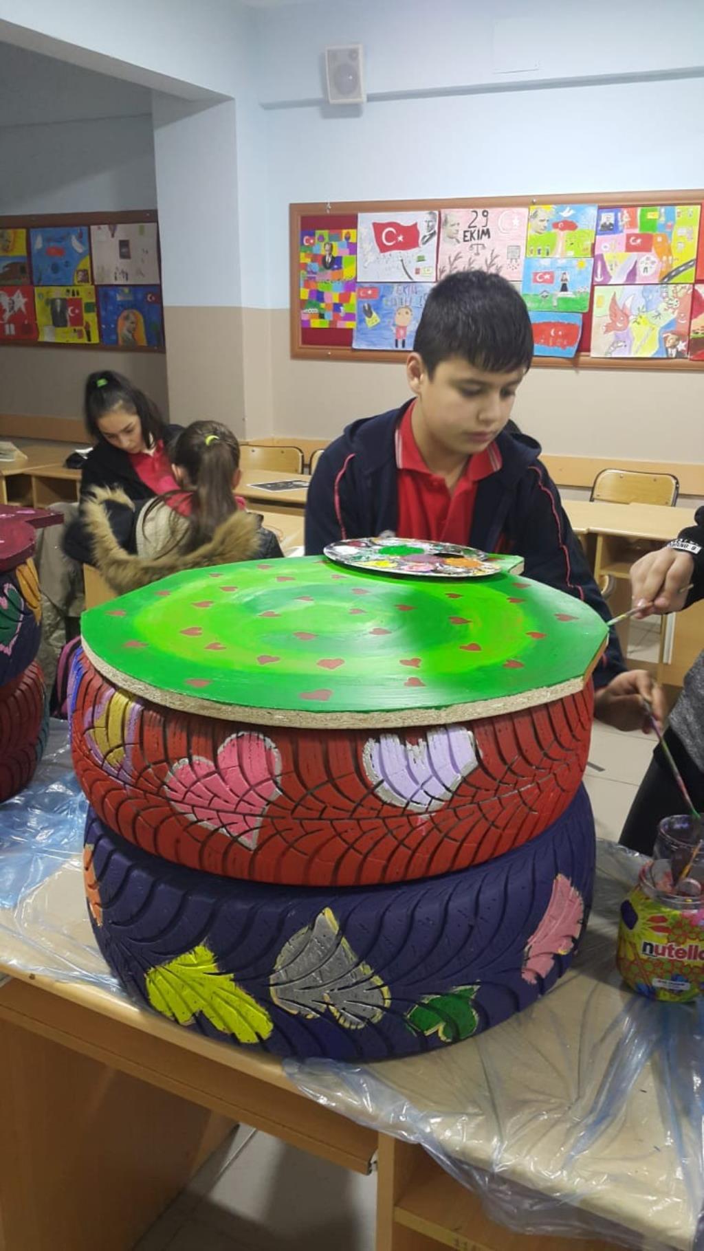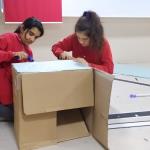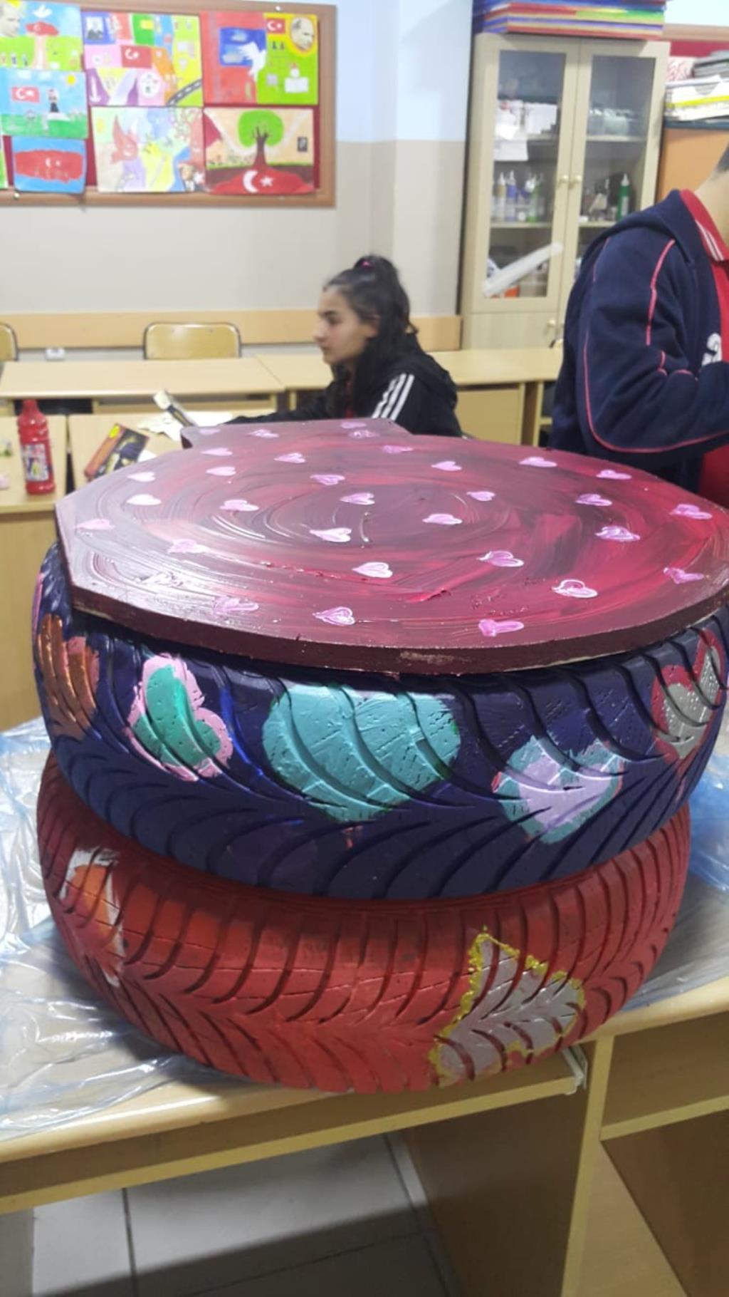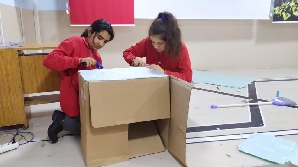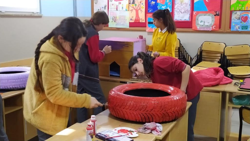 Safranbolu Vilayetler Birliği Ortaokulu 5 ve 6. sınıf öğrencileri "teknoloji tasarım" dersinde kış ayında sokakta kalan hayvanlar için araba tekerleği, karton, köpük gibi atık malzemeleri geri dönüştürerek sokak hayvanları için barınaklar yaptı.