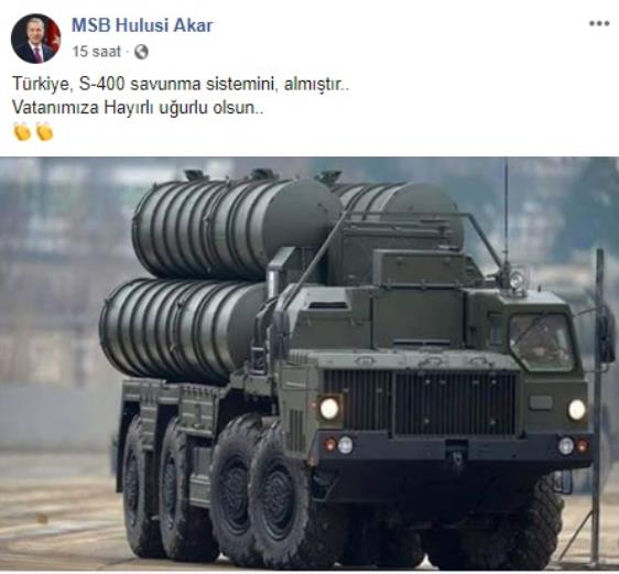 Akar, sosyal medya sayfasında müjdeyi ;"Türkiye, S-400 savunma sistemini, almıştır..
