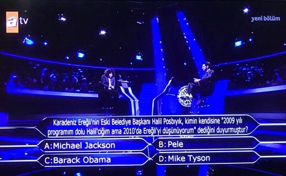ATV ekranlarının fenomen bilgi yarışması programı Kim Milyoner Olmak İster yarışmasının bu akşam yayınlanan bölümünde 60 bin TL’lik soruya Ereğli Belediye Başkanı Halil Posbıyık damga vurdu. Yarışmanın bu akşam yayınlanan bölümünde 9’uncu soruya kadar gelen yarışmacıya ‘Karadeniz Ereğli’nin eski Belediye Başkanı Halil Posbıyık kimin kendisine ‘2009 programım dolu Halil’ciğim ama 2010’da Ereğli’yi düşünüyorum’ dediğini duyurmuştur?’ Sorusu soruldu. Telefon joker hakkını kullanan yarışmacı Michael Jackson cevabını vererek soruyu doğru cevaplayarak 60 bin TL ödülün sahibi oldu.
