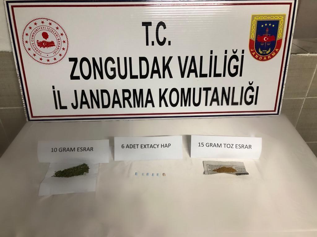 Zonguldak İl Jandarma Komutanlığınca yapılan istihbari çalışmalar sonucunda Çaycuma İlçe Jandarma Komutanlığınca Saltukova beldesi girişinde yapılan yol kontrolünde durdurulan aracın sürücüsü Z.K.'nın (43) üzerinde ve aracında arama yapıldı. Yapılan arama sonucunda 15 gram toz esrar, 10 gram kubar esrar ile 6 adet uyuşturucu hap ele geçirildi. Şüpheli Z.K., cumhuriyet savcısının talimatıyla gözaltına alınarak adli tahkikata başlandı.