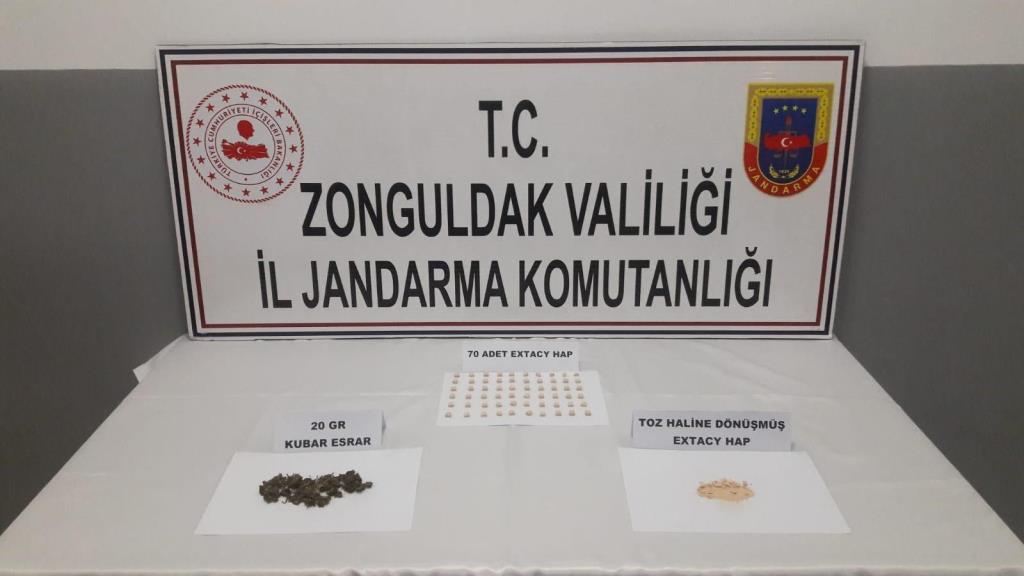 Konuyla ilgili olarak Devrek Cumhuriyet Başsavcılığından alınan karara istinaden şüphelinin içerisinde bulunduğu yolcu otobüsü saat 02.30'da durdurularak narkotik köpeğinin de katılımı ile arandı. Yapılan aramada şüphelinin çantasında 70 adet ekstasy hap, yaklaşık 10 gram parçalanmış ve toz haline gelmiş ekstasy ile 20 gram kubar esrar maddesi ele geçirildi.