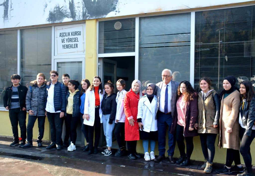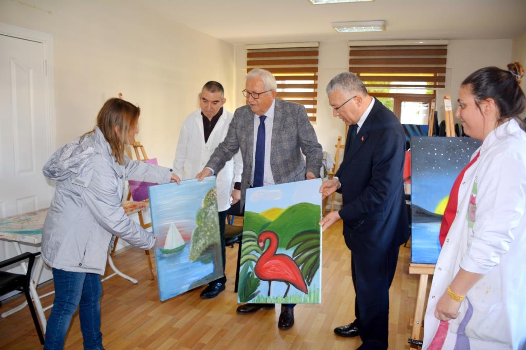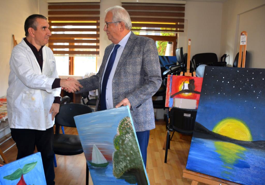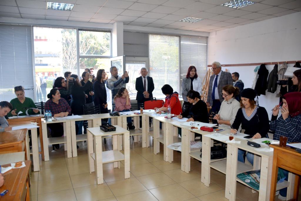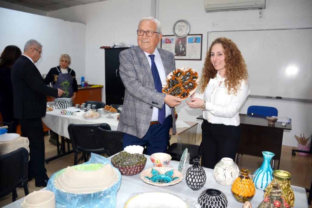Başkan Posbıyık, beraberinde başkan yardımcıları, ilgili daire müdürleri ve başkan danışmanları ile birlikte ziyaret ettiği Cumhuriyet Halk Evi’nde kurs gören mutfak, dikiş nakış, el işi, resim, sepet örme, seramik atölyesi kursiyerlerinin yaptıkları ürünleri inceledi, kursiyerlerle sohbet etti.