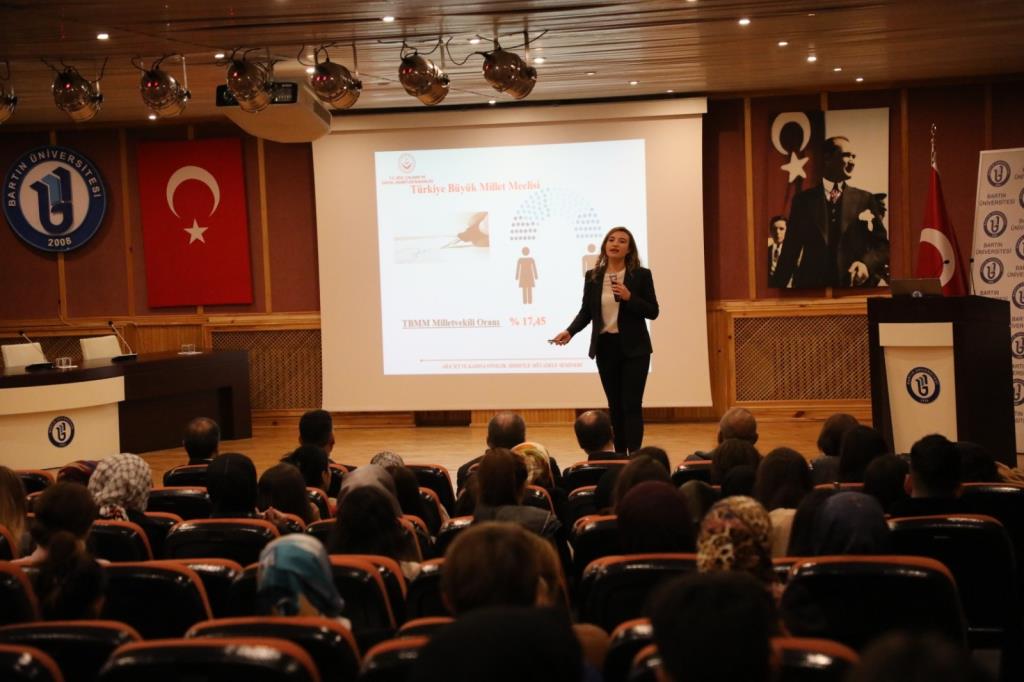 Bartın Üniversitesi ev sahipliğinde düzenlenen eğitim semineri Aile, Çalışma ve Sosyal Hizmetler İl Müdürlüğü ile Gençlik ve Spor İl Müdürlüğü iş birliğinde gerçekleştirildi. Öğrencilerin yoğun ilgi gösterdiği etkinlikte, ilk olarak Aile, Çalışma ve Sosyal Hizmetler İl Müdürlüğü Şiddeti Önleme ve İzleme Merkezinden Çağla Yılmaz tarafından ‘Kadına Yönelik Şiddet’ başlığında bilgiler verildi.