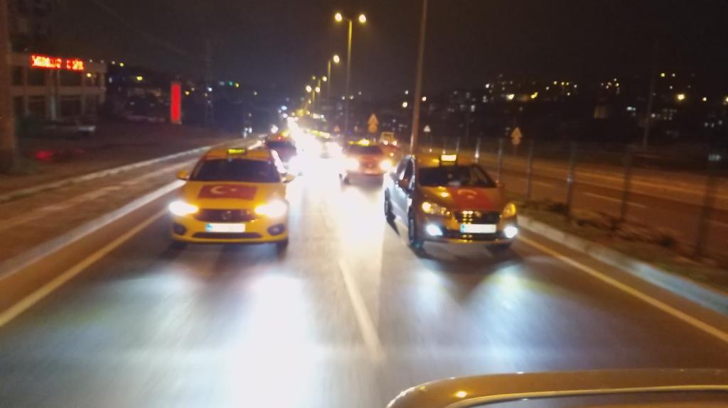 Karadeniz Ereğli taksicileri akşam saatlerinde Cumartesi Pazarı mevkiinde ‘Barış Harekatına’ destek olma amacıyla toplandılar. Tugay Altınbaş, Samet Artar ve Ömer Çakır öncülüğünde toplanan taksiciler 45 araç ile konvoy düzenlediler. Cumartesi Pazarından konvoya başlayan taksiciler Kepez istikametinden Karadeniz Bölge Komutanlığının önünde son buldu. Karadeniz Bölge Komutanlığının önünde açıklama yapan Tugay Altınbaş; “Karadeniz Ereğli taksicileri olarak sınır ötesi operasyonda bulunan tüm Mehmetciğimize canı gönülden destek veriyoruz. Allah yar ve yardımcıları olsun.” Dedi. Tugay Altınbaş’ın açıklamasının ardından taksiciler tekbir getirdi. Tekbirin ardından taksiciler olaysız olarak dağıldı.
