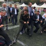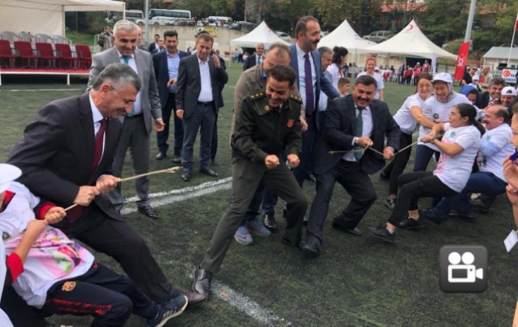 Zonguldak Valisi Erdoğan Bektaş ve beraberindeki protokol üyeleri, halat çekme oyununda çocuklara destek vermek istedi. Çekişmeli geçen halat çekme oyununda ip koptu, protokol üyeleri yere düştü. O anlar ise saniye saniye kameralara yansıdı.
