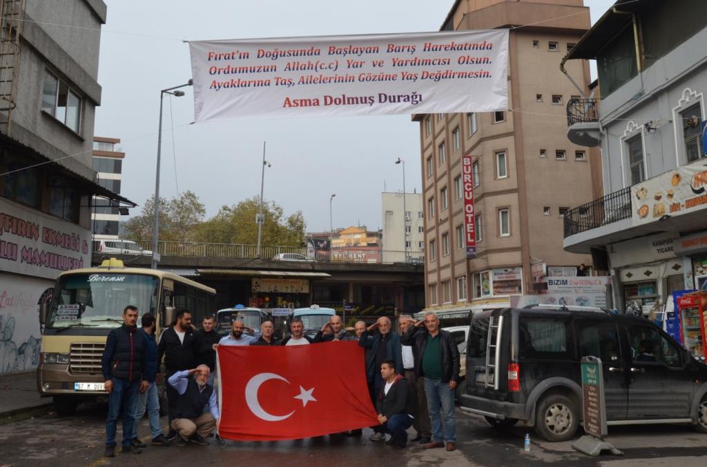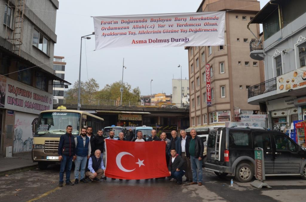 Asma dolmuş durağı esnafı Dursun Sarıkaya yaptığı açıklamada, Barış Pınarı Harekâtında Türk askerinin yanında olduklarını ifade ederek “Mehmetçiğimizin ve Türk ordumuzun yanındayız. Gerekirse bu yaşta bizde savaşa hazırız. Asma dolmuş durağı ve Türk milleti olarak sonuna kadar devletimizin hükümetimizin yanındayız. Amerika’yı dize getirmesini bildik. Alınan karara çok memnun olduk. Başkanımızın ve Türk milletinin dik duruşu batılı ülkeleri dize getirmesini bildi” dedi.