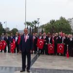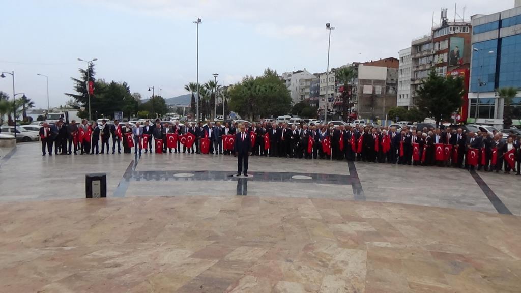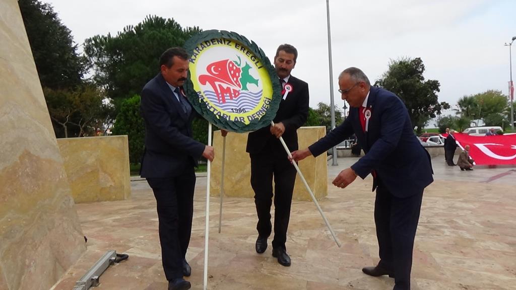 Devrim Bulvarındaki Atatürk Anıtı önünde düzenlenen törende, Karadeniz Ereğli Muhtarlar Derneği Şükrü Kılıç’ın, Anıta çelenk koymasının ardından, saygı duruşunda bulunuldu, İstiklal Marşı okundu. Bu arada muhtarlar tarafından alanda Dev Türk Bayrağı açıldı.