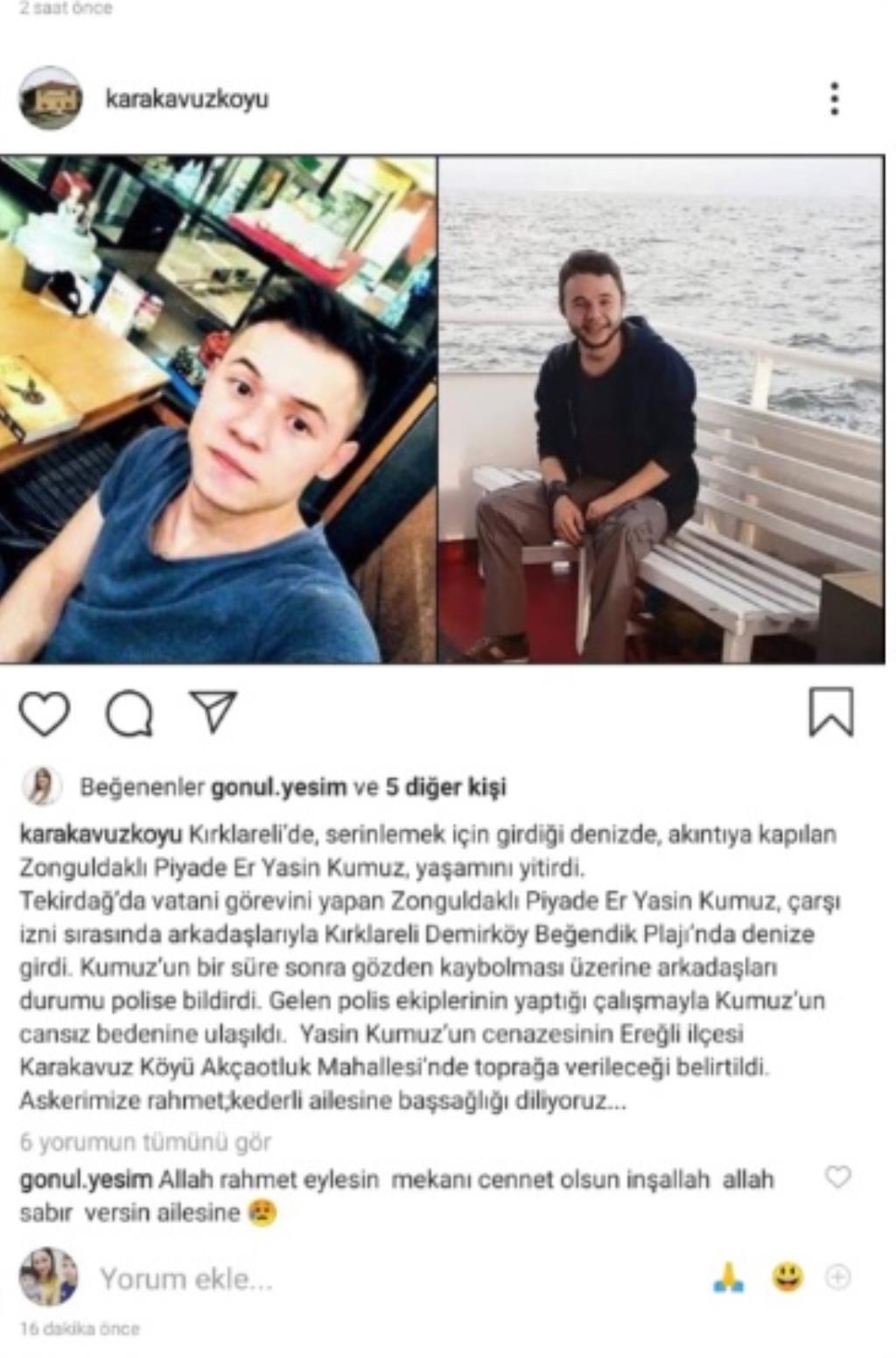 Tekirdağ’da vatani görevini yapan Zonguldaklı Piyade Er Yasin Kumuz, çarşı izni sırasında arkadaşlarıyla Kırklareli Demirköy Beğendik Plajı’nda denize girdi. Kumuz’un bir süre sonra gözden kaybolması üzerine arkadaşları durumu polise bildirdi. Gelen polis ekiplerinin yaptığı çalışmayla Kumuz’un cansız bedenine ulaşıldı. 2 aylık asker olduğu öğrenilen Yasin Kumuz’un yarın Zonguldak’ın Ereğli ilçesinde toprağa verileceği öğrenildi.