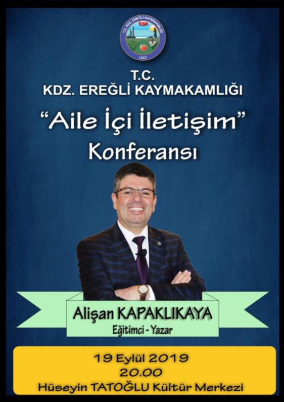 Kdz. Ereğli Kaymakamlığı tarafından 18 Eylül 2019 Çarşamba günü, saat 19.30 ve 19 Eylül 2019 Perşembe günü saat 20.00’de, Hüseyin Tatoğlu Kültür Merkezinde “Aile İçi İletişim” konferansı gerçekleştirilecek. Konferansta Eğitimci- Yazar Alişan Kapaklıkaya katılımcıları aile içi iletişim konusunda bilgilendirecek.