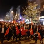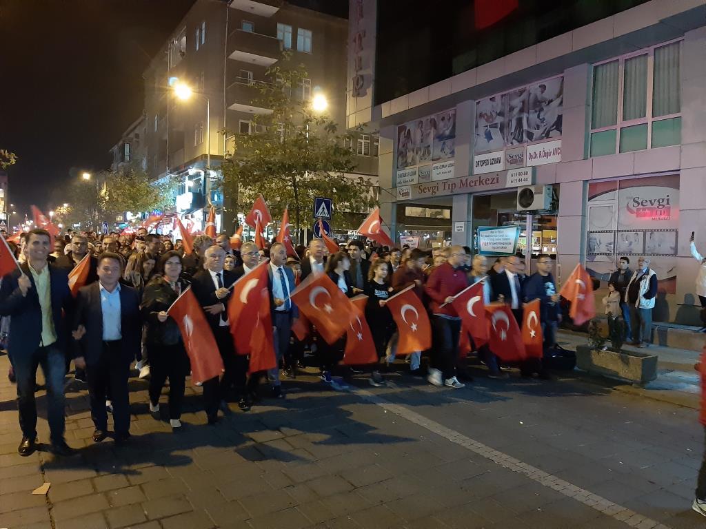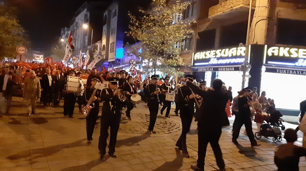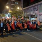 Atatürk Anıtı önünde başlayan yürüyüş korteji Dev Türk bayrağını açarak Nihat Kantarcı caddesi üzerinden Uğur Mumcu caddesine doğru yol boyunca devam etti. Müze evin önünde son bulan fener alayında vatandaşlar büyük Türk Bayrağı ile hatıra fotoğrafı çekilirken bir yandan da havai fişek gösterisin ilgiyle izleyerek bu anı cep telefonu kameralarına kaydetti.