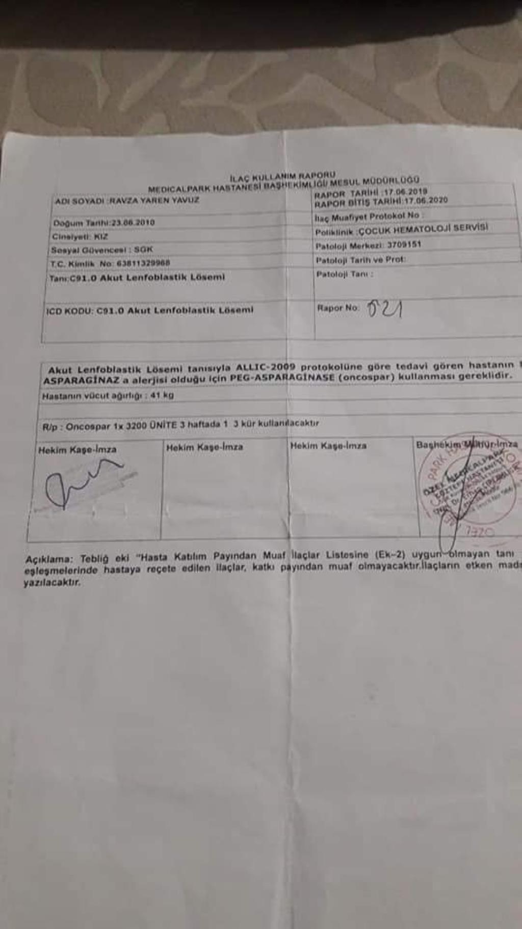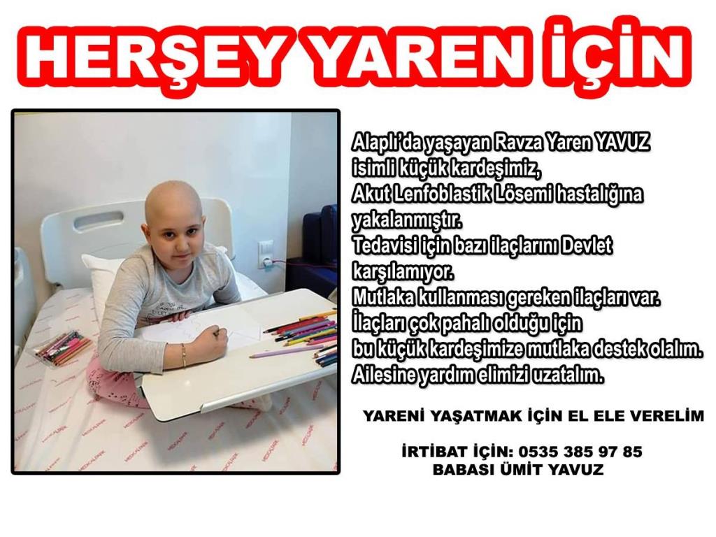 Akut Lenfoblastik Lösemi hastalığına yakalanan Ravza Yaren Yavuz’un tedavisi için gerekli olan ilaçların ücretlerini karşılamıyor. Ravza Yaren Yavuz’un tedavisi için gerekli olan ilaçlar pahalı olduğundan dolayı yardım bekliyor. Ravza Yaren Yavuz’un hastalığını öğrenen yakınları ‘Az çok demeden kardeşimize ve ailesine yardım elini uzatalım. Haydi Alaplı Yaren’i yaşatmak için el ele verip desteğimizi gösterelim!’ diyerek yardım beklediklerini belirttiler.