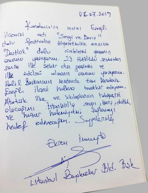 İstanbul Büyükşehir Belediye Başkanı Ekrem İmamoğlu, Karadeniz Ereğli ziyareti sırasında Belediye Özel Şeref Defteri’ne yazdığı mesajda, “Sevgi ve barış dolu festivalde dostluk dolu cümlelerimi yazmanın onurunu yaşıyorum” dedi.