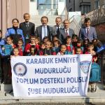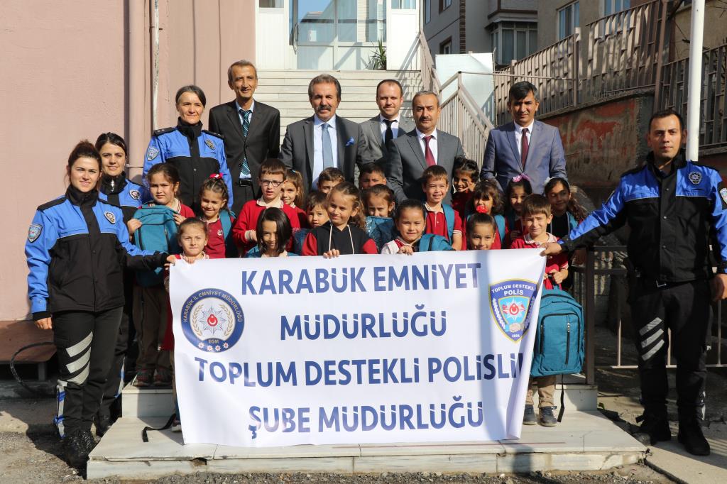 Karabük Emniyet Müdürlüğü Toplum Destekli Polislik Şube Müdürlüğü tarafında hayata geçirilen sosyal sorumluluk projesi kapsamında karabük Şehit özcan Ören İlkokulu birinci ve ikinci sınıf öğrencilerine çanta, kitap ve kırtasiye malzemesi dağıtıldı.