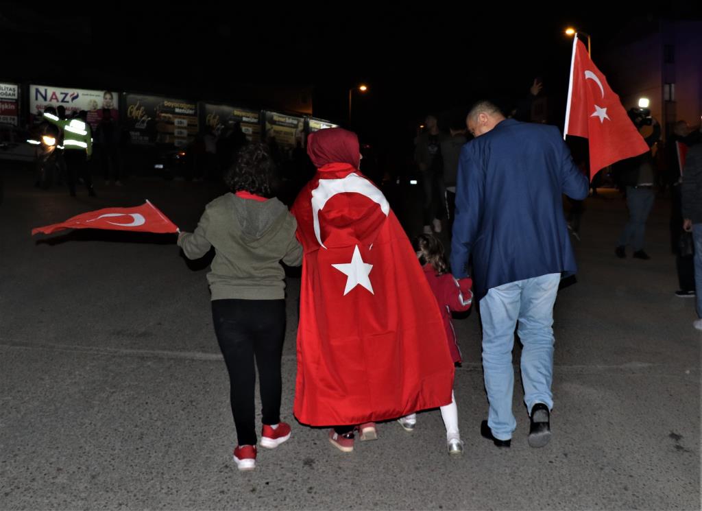 Belediye bandosu eşliğinde yapılan yürüyüşte 7’den 70’e yüzlerce vatandaş ve öğrenci, ellerinde Türk bayraklarıyla yürüdü.