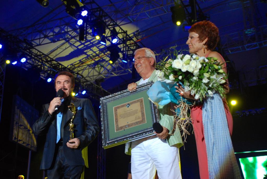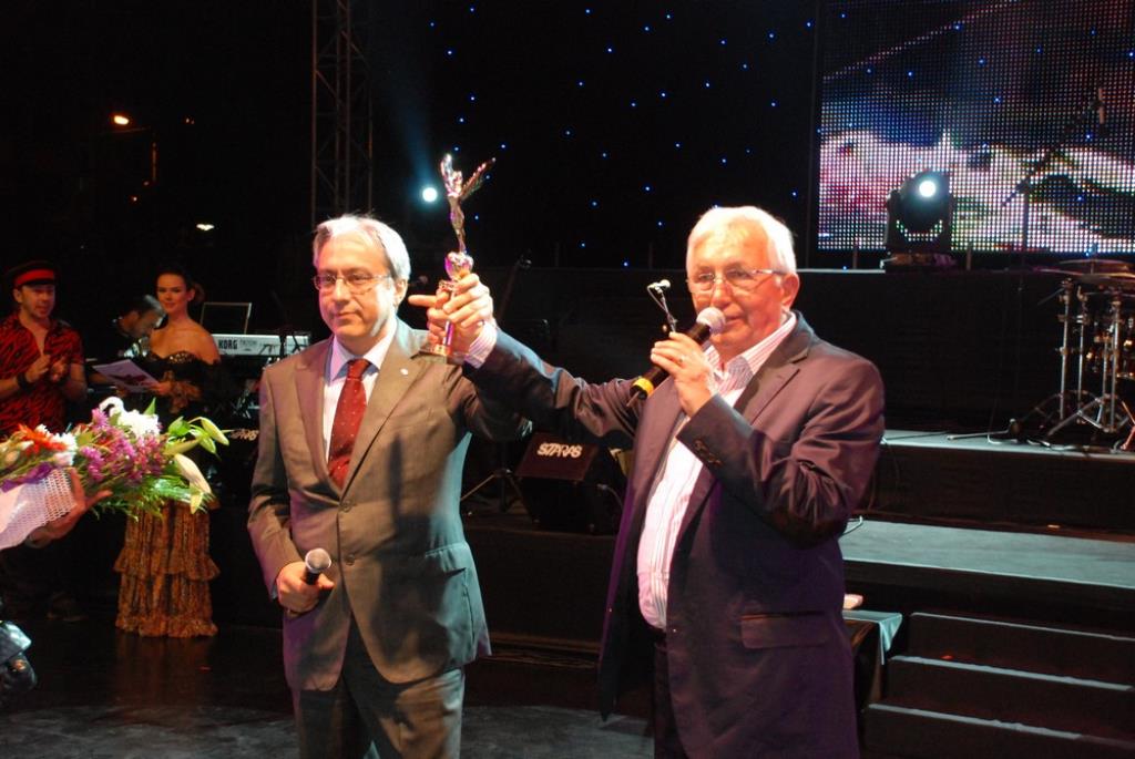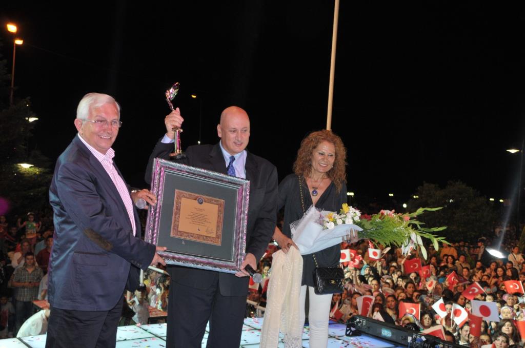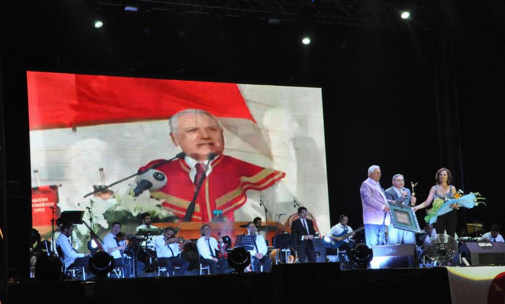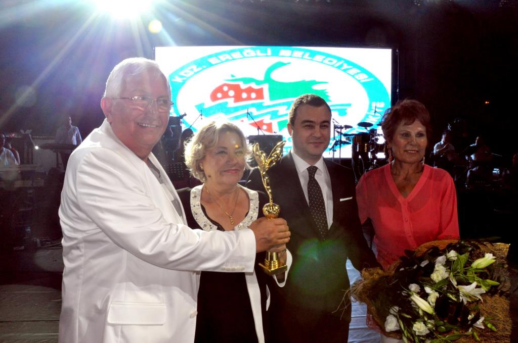 TURGUT ÖZAKMAN: Bu ödüllerimizin arkası kesilmedi ve "Şu Çılgın Türkler" kitabının yazarı Rahmetli Turgut Özakman’ı yüz binlerce seveninin önüne çıkarıp Karadeniz Ereğli festival sahnesinde kendisine Sevgi, Barış,Dostluk Ödülü’nü verdik.