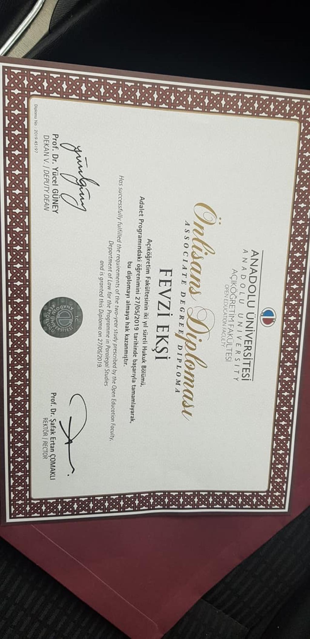 Kdz. Ereğli önceki dönem Belediye Meclis Uyesi 60 yaşındaki Kabzımal Fevzi Ekşi Eskişehir Anadolu Üniversitesi Adalet Bölümü’nü tamamlayarak ön lisans mezunu oldu.