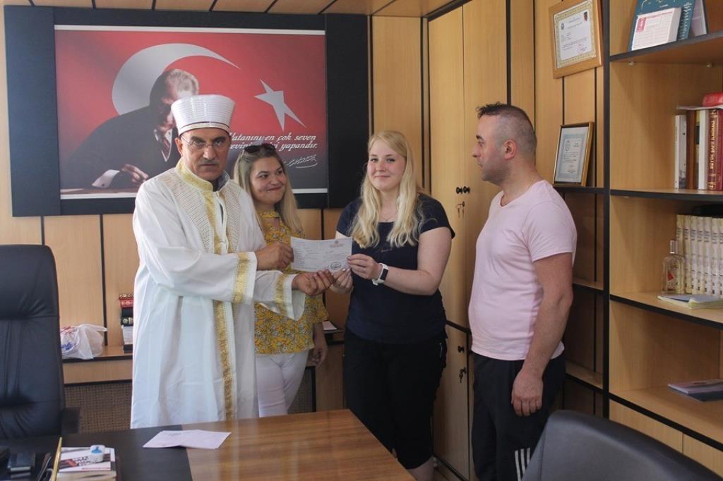 İlçe Müftüsü Ayhan Ermiş, Müslüman olmak isteyen Maritta Kristina ve beraberindekileri makamında konuk etti. Ermiş, İslam dininin iman esasları ve ibadetler ile ilgili bilgiler verdikten sonra Şube Müdürü Erdal Oruçoğlu, Vaiz Ferdi Bayduz ve Şef Hayrettin Çakır’ın da hazır bulunduğu şahitlerin huzurunda Maritta Kristina 'Kelime-i Şehadet' getirerek Müslüman oldu. Finlandiya vatandaşı Maritta Kristina, bütün dinleri araştırdığını ve Müslümanlığın kendi düşüncelerine daha yakın olduğu ve İslamiyeti beğendiği için Müslüman olmak istediğini belirterek, Türk genci ile nişanlandığı ve bir ay sonra gelerek düğünlerinin olacağını açıkladı.