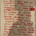 "Sizleri gördüm televizyonda yine. Sanki düğüne gider gibi gidiyordunuz cepheye. Yine oturdum masanın başına duygulandım ve sizlere mektup yazmak istedim yine. Hani vardı ya üç yaşında bir çocuk Afrin’de şöyle demişti düşmana; ’Sizi Allah’a şikayet edeceğim’ Anladım ki, o çocuk şikayet etmiş Allah’a, Allah da sizi yollamış intikam almaya. Bir daha çocuklar ölmesin, bayrağımız inmesin, ezanlar dinmesin, anneler ağlamasın barış gelsin tüm dünyaya. Allah sizleri korusun."