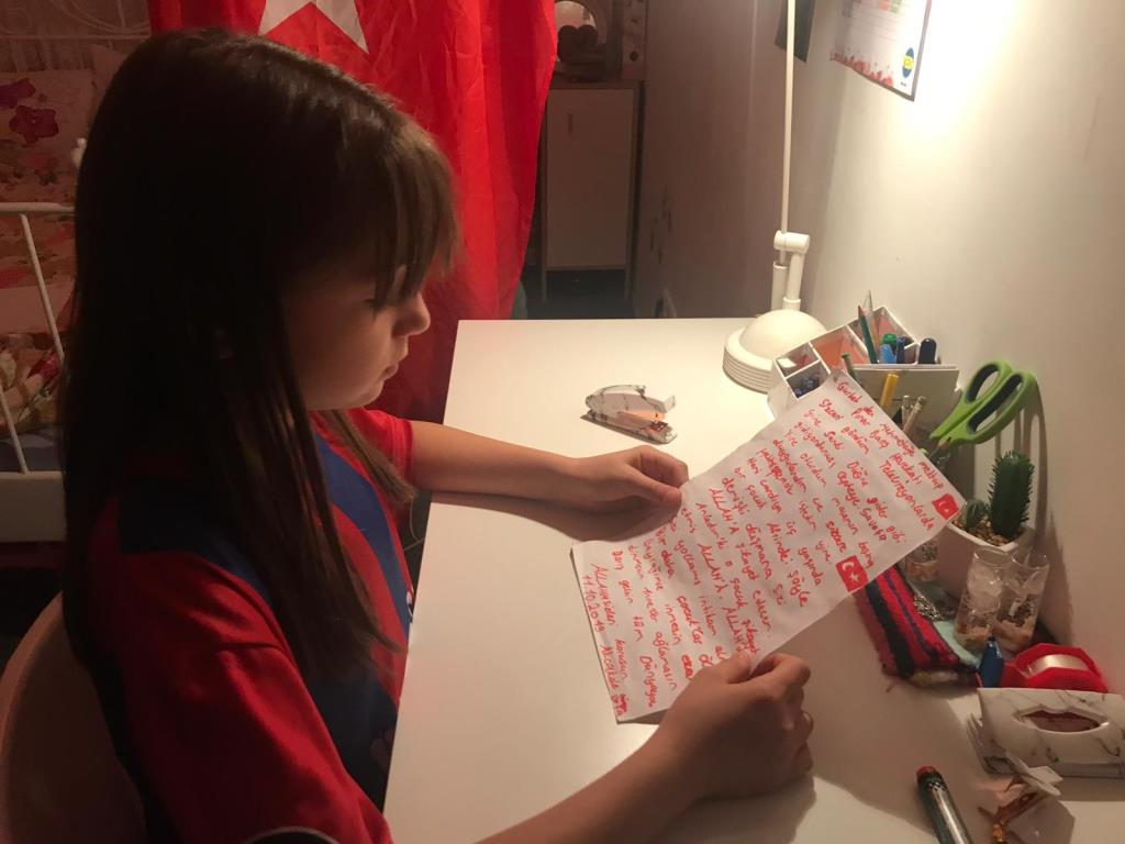 Almanya’da yaşayan Türk ailenin 9 yaşındaki kızları Ecrin İnam, Türk Silahlı Kuvvetleri ve Suriye Milli Ordusu'nun (SMO), Fırat’ın doğusunda PKK/YPG ve DEAŞ terör örgütlerine yönelik başlattığı Barış Pınarı Harekatı’na ve Mehmetçik’e destek için mektup yazdı.