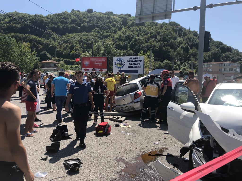 Kaza, saat 13.30 sıralarında Alaplı Ereğli karayolu üzerindeki OSB'ye giden kavşakta meydana geldi. Hüseyin A.'nın kullandığı 34 BVC 363 plakalı otomobil, OSB yolunda kavşaktan hareket eden Öznur T.'nin kullandığı 34 EF 4895 plakalı otomobil ile çarpıştı. Çarpışmanın şiddetiyle OSB yolundan gelen ve içinde 5 kişi bulunan otomobil savrularak refüje çıktı. Durumun haber verilmesiyle olay yerine 112 Acil Servis, Ereğli Belediyesi İtfaiye Müdürlüğü ve polis ekipleri sevk edildi. Kazada refüje çıkan araçtaki yaralılardan üçü, Ereğli İtfaiye Müdürlüğüne bağlı kurtarma ekipleri tarafından sıkıştıkları yerden çıkartıldı. Büyük çaba harcayan itfaiye ekiplerinin çalışmalarına polis ve sağlık ekipleri de destek verdi. Kazada sürücüler Hüseyin A. ve Öznur T. ile iki araçta bulunan toplam 6 kişi yaralandı. Aracın kapısı kesilerek açılan bölümden dışarı çıkarılan yaralılar sağlık ekiplerine teslim edildikten sonra diğer yaralılarla birlikte Ereğli'deki hastanelere sevk edilerek tedavi altına alındı. Yaralılardan birinin sağlık durumunun ağır olduğu öğrenildi.