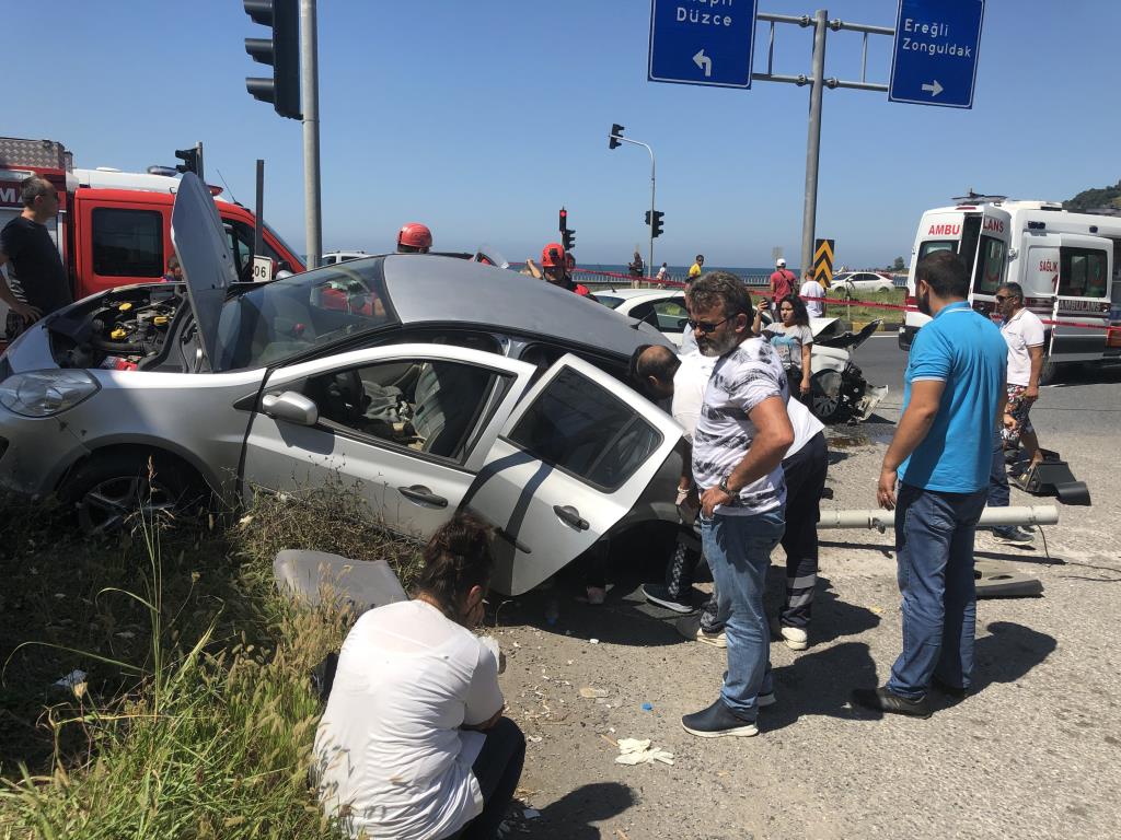 ZONGULDAK (İHA) - Zonguldak Ereğli plajlar mevkisinde meydana gelen trafik kazasında biri ağır 6 kişi yaralandı. Ortalığın savaş alanına döndüğü kazada yaralılardan üçü otomobilde sıkıştığı yerden itfaiye ekipleri tarafından kurtarıldı.